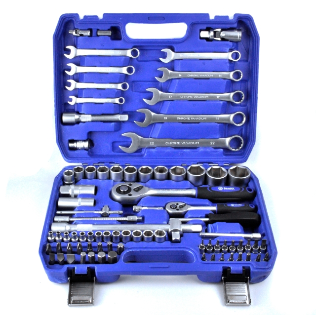 Универсальный набор ключей с трещоткой предназначен для крепежных работ дома, на даче, в автомастерской, для гаража. Набор 82 предмета автомобильный для ремонта выполнен из специальной закаленной стали с повышенным содержанием углерода, с помощью ступенчатой закалки V3. Прочные металлические замки и эргономичный ударопрочный кейс чемодан, делают набор головок с трещоткой эффективным и мобильным.