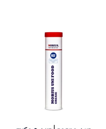 Mobius Uni Food Grease 222 – специальная пластичная смазка, изготовленная из синтетического базового масла с добавлением современного пакета присадок и стабильного синтетического загустителя, обогащена политетрафторэтиленом. Эти смазки физиологически безвредны, обладают нейтральным запахом. Смазка имеет очень липкую текстуру, что дает ей высокую сопротивляемость к центробежной силе. Uni Food Grease обеспечивает максимальную коррозионную защиту очень длительный период эксплуатации. Обладает высокой стойкостью к окислению и имеет превосходную водостойкость. Диапазон температур применения: от −40 °С до +160 °С (Кратковременно до +180°С)